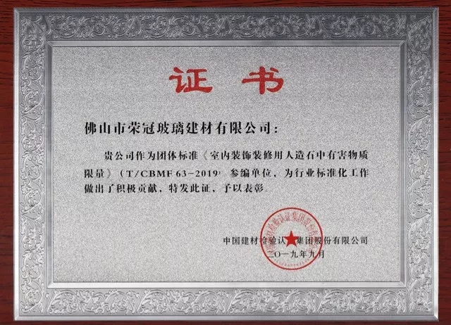 由佛山市榮冠玻璃建材有限公司參編的《室內裝飾裝修用人造石中有害物質限量》標準,已于10月31日開始正式實施。