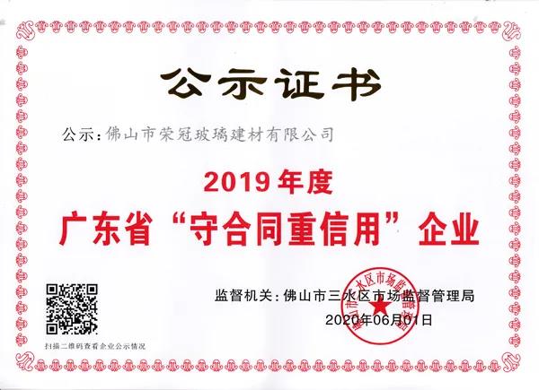 近期,佛山市信用管理協會對2019年度廣東省“守合同重信用企業”進行公示,榮冠公司憑借良好的市場信譽和優質的產品服務,順利通過市場監管部門的最終評審,并獲相應的榮譽牌匾和證書。在三十多年的誠信經營中,榮冠公司屢獲該項殊榮。
