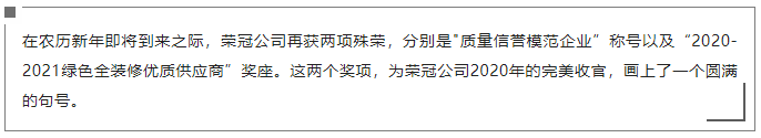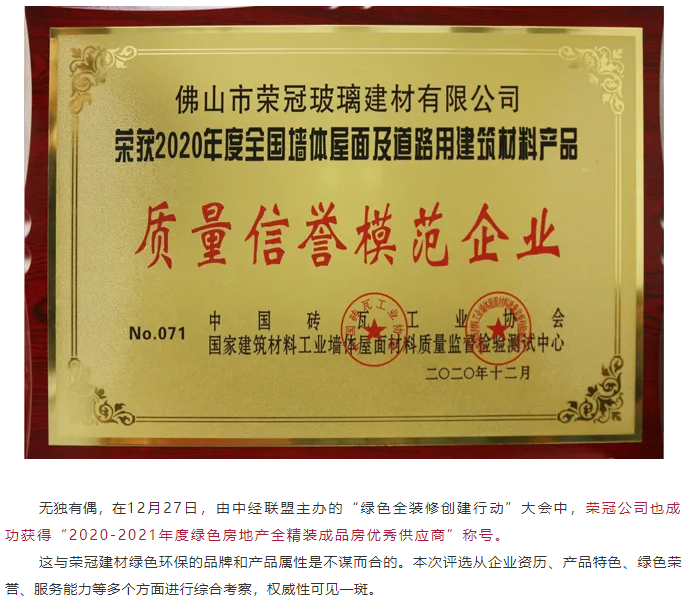 完美收官 | 榮冠公司再獲“質量信譽模范企業”及“綠色全裝修優質供應商”兩項殊榮