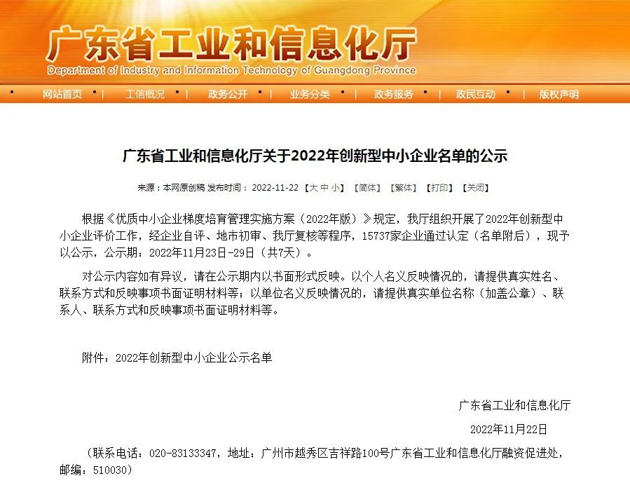 近日,廣東省工業和信息化廳公示了2022年創新型中小企業名單,經企業自評、地市初審、省廳復核等程序,榮冠公司成功獲得“2022年創新型中小企業”資質認定。