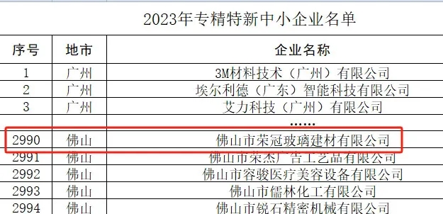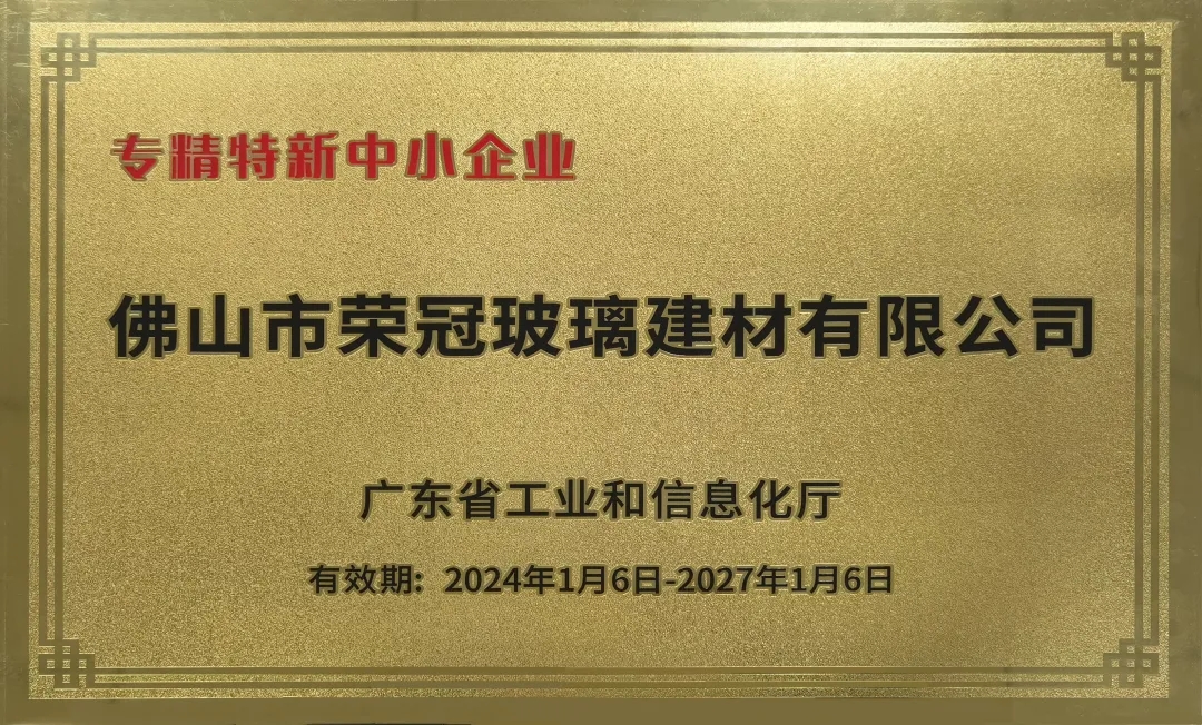 近日,省工信廳公布了2023年“專精特新中小企業(yè)”名單,經專家綜合評定并公示,佛山市榮冠玻璃建材有限公司榮獲專精特新中小企業(yè)榮譽稱號,這是榮冠公司在2018年獲得”佛山市專精特新企業(yè)”之后再添殊榮,充分展示了榮冠公司的自主創(chuàng)新力與核心競爭力。