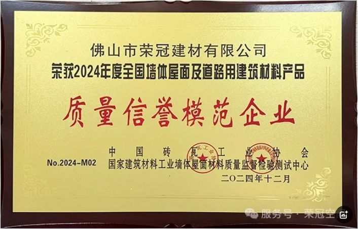 為了鼓勵產品質量好、綜合效益高、節能環保利廢及管理水平優異的企業,中國磚瓦工業協會和國家建筑材料工業墻體屋面材料質量監督檢驗測試中心決定對表現優秀的企業授予“2024年度質量信譽模范企業”稱號,榮冠公司喜獲該項殊榮。