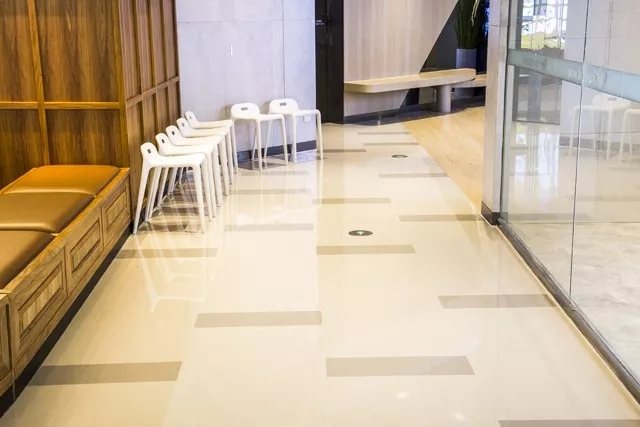 當我們細心觀察,不難發現室內地面以白色為主色調,以棕色為主要配色。不同色彩的榮冠崗石產品,富有層次感的地面排列鋪貼,不僅絲毫不亂,還顯得自然和諧,仿佛地面跳動的音符。