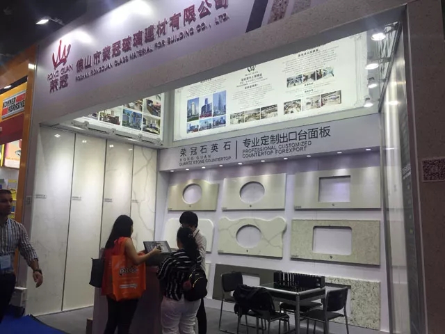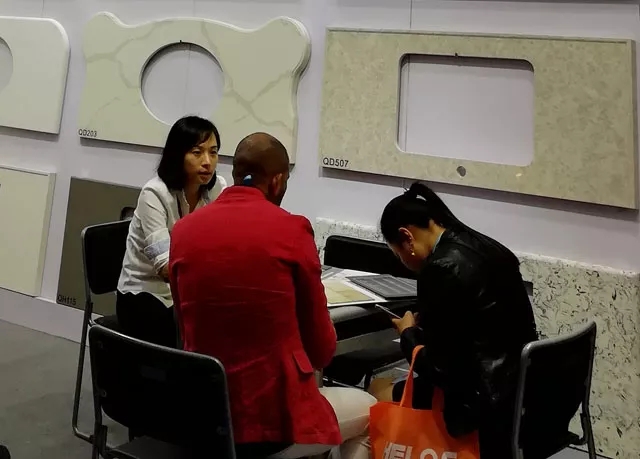 在展會現(xiàn)場,榮冠出口部工作人員向蒞臨展位的客戶講解了榮冠石英石臺面產(chǎn)品的品質(zhì)優(yōu)勢,與來自全球各地的嘉賓深入洽談合作。通過參觀展品和工作人員的介紹,現(xiàn)場有多位客戶表示出進(jìn)一步合作的意向。